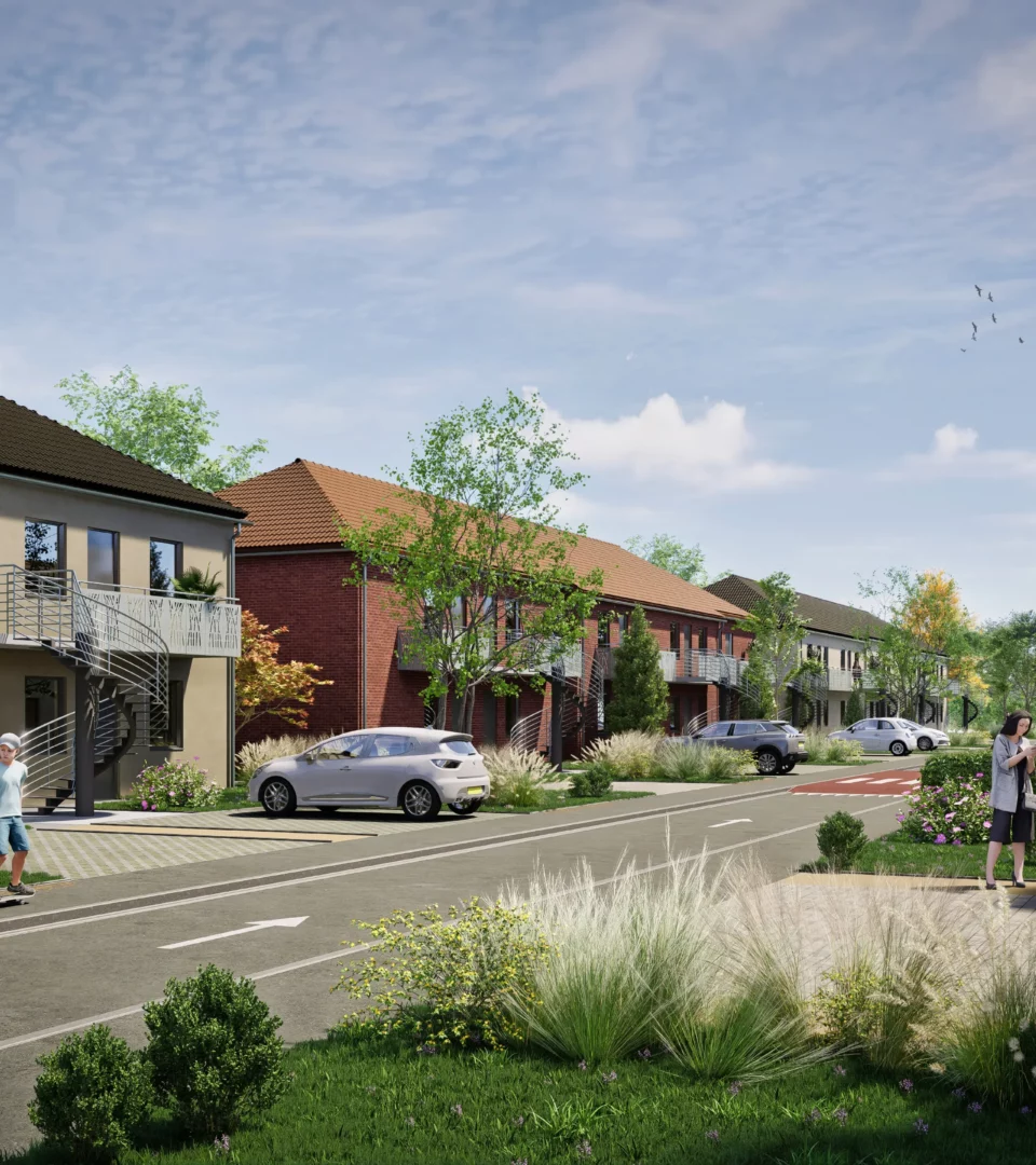 Réalisation de 8 logements en béguinage, de 24 logements collectifs et de 54 maisons dans un cadre apaisé proposant aires de jeux et liaisons douces.